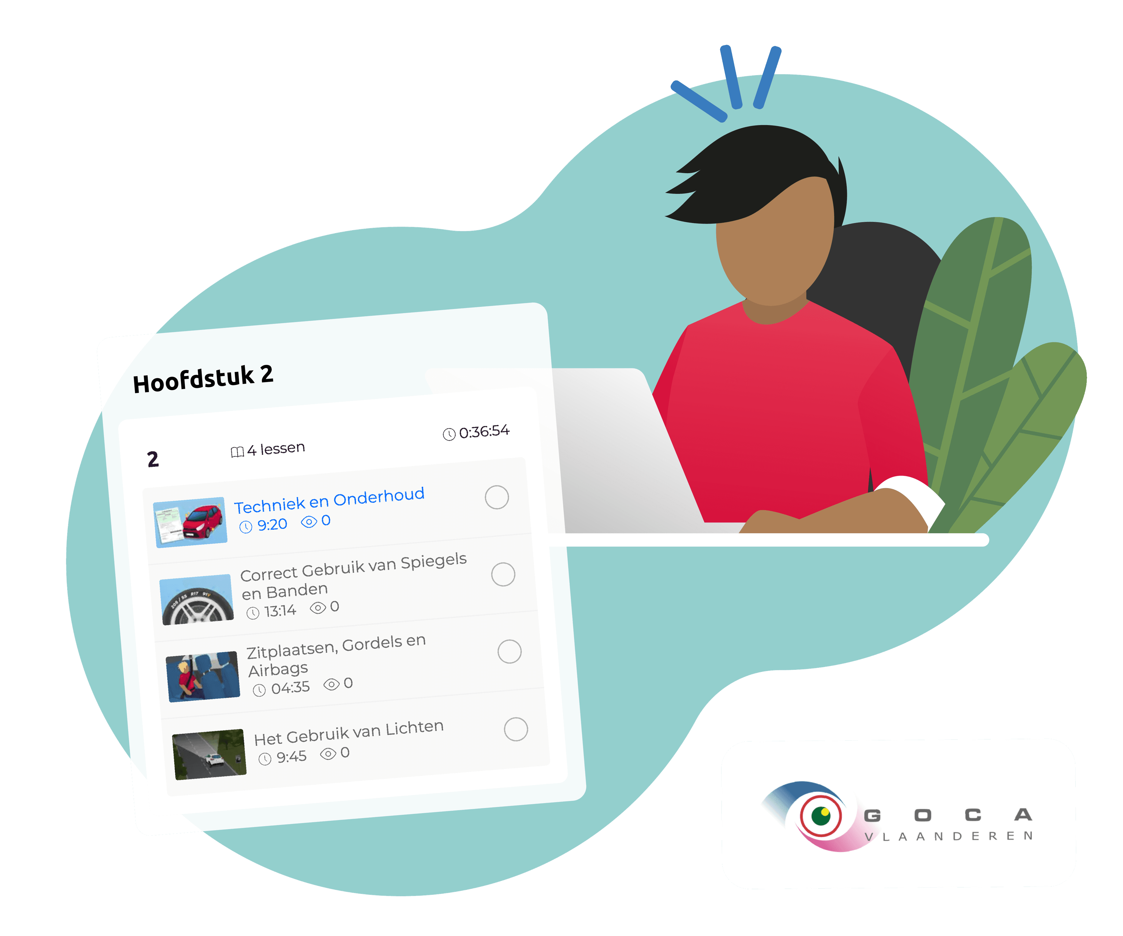 Je kan de oefeningen maken op je computer, laptop, tablet of gsm. Je krijgt toegang tot alle onderdelen van het examen en leert welke soorten vragen je mag verwachten bij GOCA. Zo vergroot je je kans om meteen te slagen.